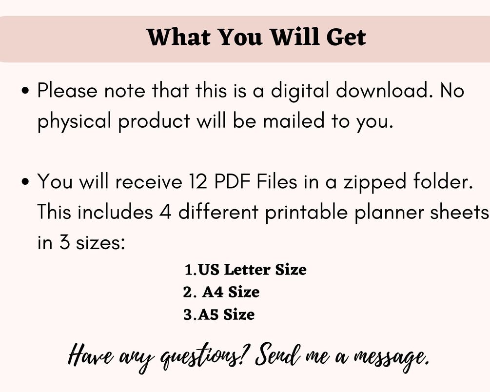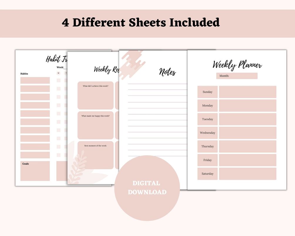 This listing includes 4 different printable sheets. each sheet comes in 3 different sizes for you to choose from. You will receive a zipped folder with 12 high quality PDF Files: 1. Weekly Planner in US Letter Size, A4 Size, A5 Size 2. Weekly habit Tracker in US Letter Size, A4 Size, A5 Size 3. Weekly Reflection in US Letter Size, A4 Size, A5 Size 4. Notes in US Letter Size, A4 Size, A5 Size