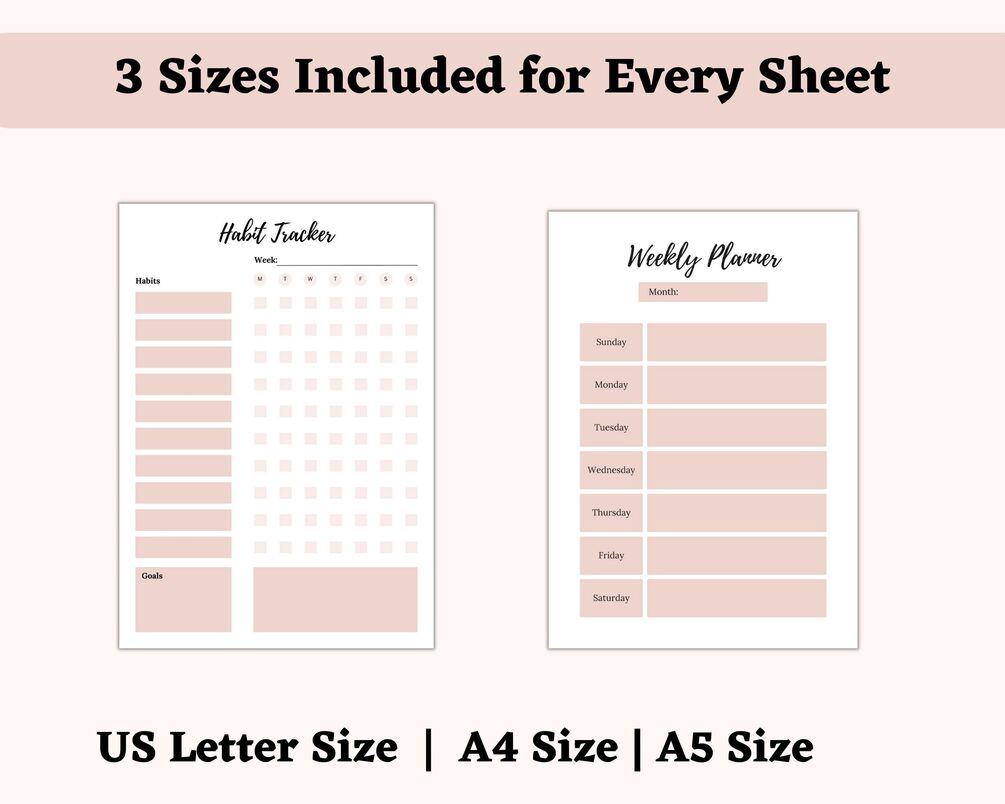 This listing includes 4 different printable sheets. each sheet comes in 3 different sizes for you to choose from. You will receive a zipped folder with 12 high quality PDF Files: 1. Weekly Planner in US Letter Size, A4 Size, A5 Size 2. Weekly habit Tracker in US Letter Size, A4 Size, A5 Size 3. Weekly Reflection in US Letter Size, A4 Size, A5 Size 4. Notes in US Letter Size, A4 Size, A5 Size